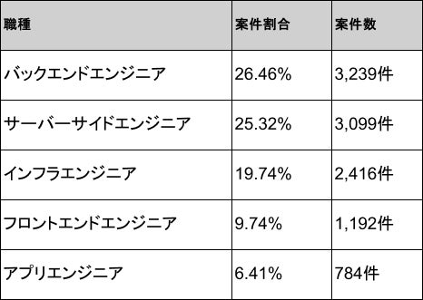 2025年10月時点のRuby案件の職種は、バックエンドエンジニア26.46%(3,239件)が最多、次いでサーバーサイドエンジニア25.32%(3,099件)、インフラエンジニア19.74%(2,416件)、フロントエンドエンジニア9.74%(1,192件)、アプリエンジニア6.41%(784件)です。