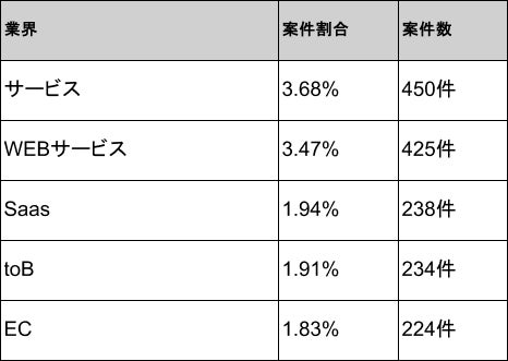 2025年10月時点のRuby案件は、サービスが3.68%(450件)で1位、Webサービスが3.47%(425件)で2位、SaaSが1.94%(238件)で3位、toBが1.91%(234件)で4位、ECが1.83%(224件)で5位となり、上位5業界で全体の約12.8%を占めます。