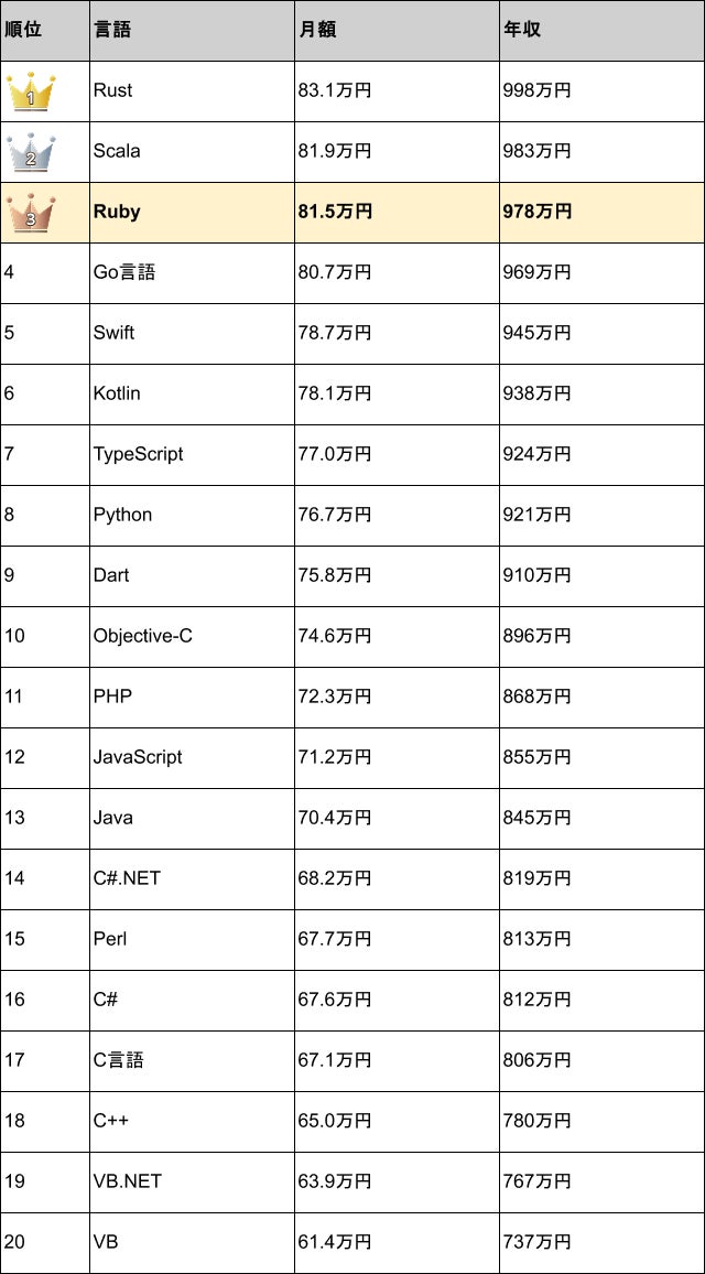 Ruby案件の平均月額単価は81.5万円、平均年収は978万円で、プログラミング言語別の年収ランキングでは3位に位置しています。
