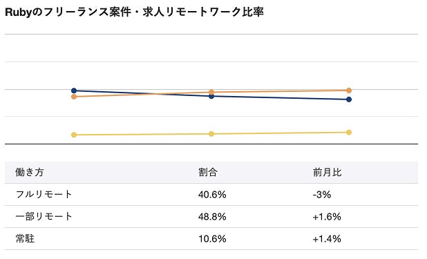2025年10月時点のRubyフリーランス案件・求人におけるリモートワーク比率は、フルリモートが40.6%、一部リモートが48.8%、常駐が10.6%です。前月比はフルリモートが−3%で減少し、一部リモートは+1.6%で増加、常駐は+1.4%と小幅に上昇しています。