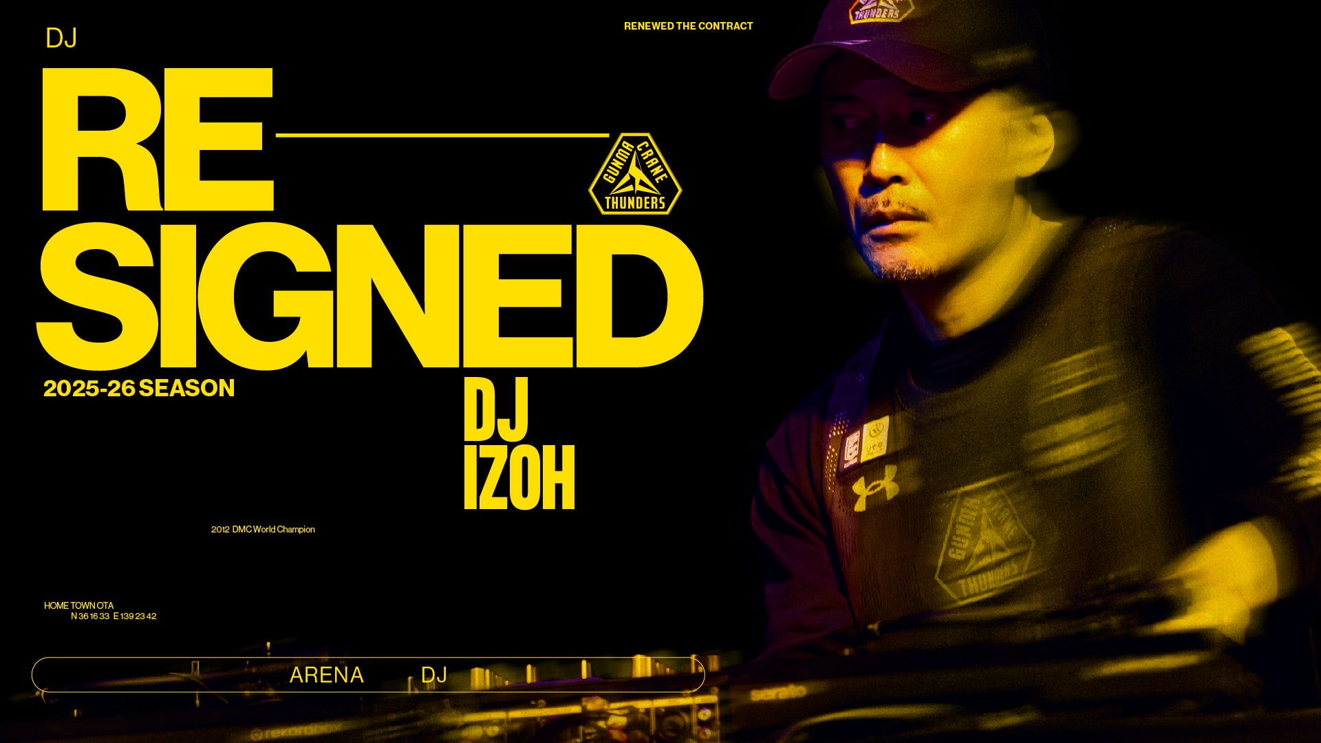 「2025-26シーズンも群馬クレインサンダーズアリーナDJを継続させていただくこととなりましたDJ IZOHです。3シーズン目のDJということで、今まで以上に良いプレイを心がけ、昨シーズンのCS出場という成績をさらに超え、チームが優勝するためにDJさせていただきます。そして、オープンハウスアリーナ太田という最高の環境で見られるたくさんのドラマを楽しみにしています。」