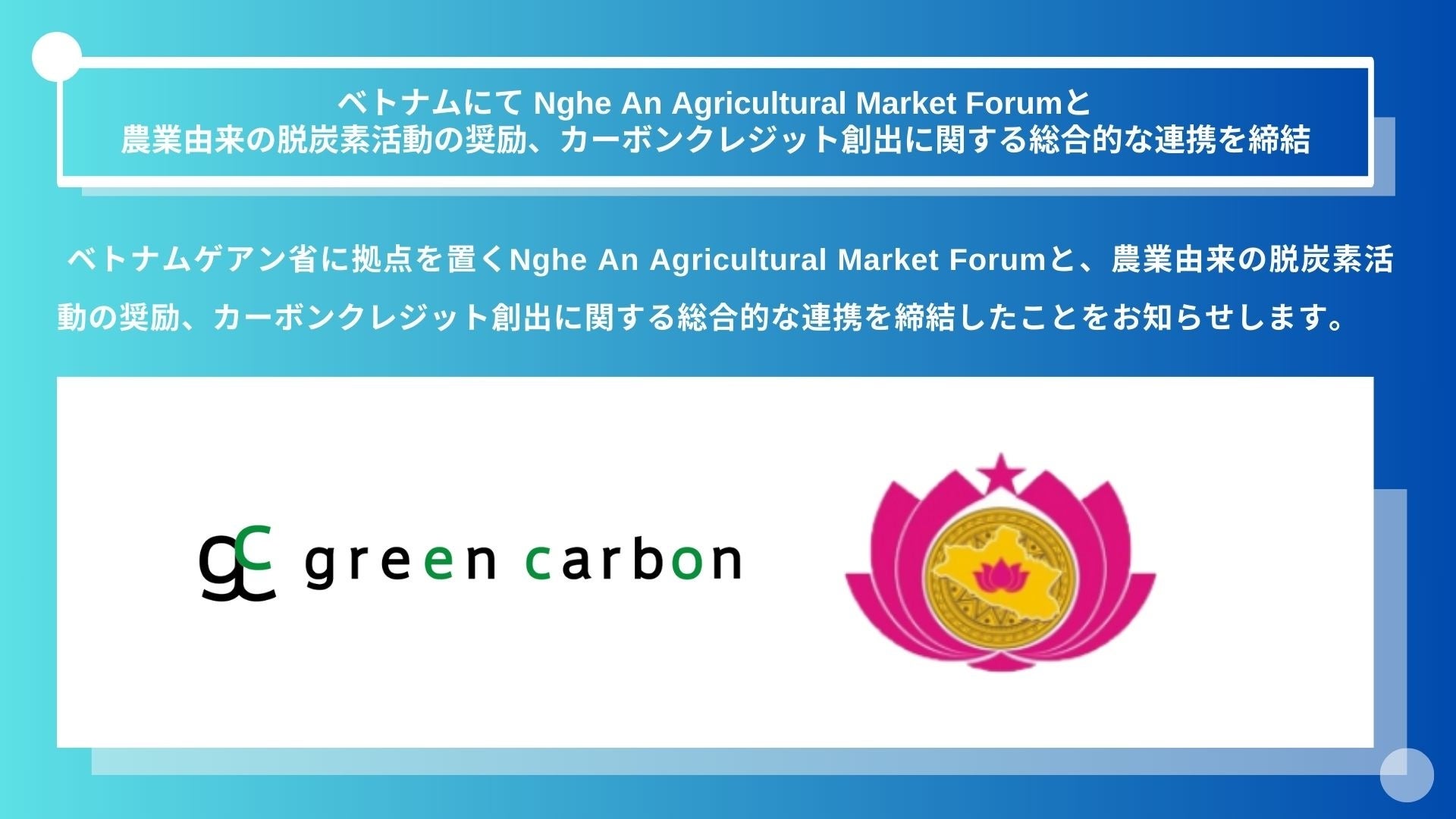 Green Carbon株式会社(代表取締役:大北潤、以下Green Carbon(読み:グリーンカーボン))はこの度、 ベトナムゲアン省に拠点を置くNghe An Agricultural Market Forum(管理委員会所長: Ms. VÕ THỊ NHUNG 、以下AMPF)と、農業由来の脱炭素活動の奨励、カーボンクレジット創出に関する総合的な連携を締結したことをお知らせします。