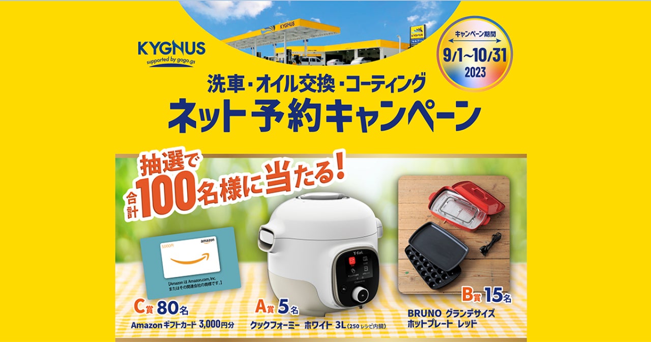【キグナス石油×gogo.gs】抽選で100名様に当たる!ネット予約キャンペーンが9月よりスタートいたします