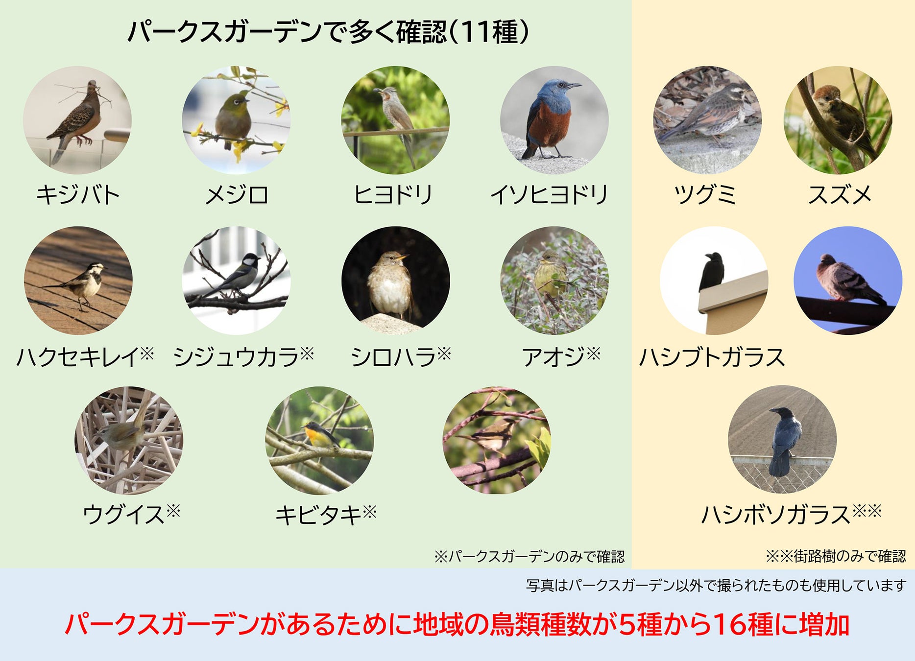 定量調査以外に確認した種も含めると、5目16科25種の鳥類を確認し、その中には、キビタキ、メボソムシクイ上種などの渡り鳥が含まれており、パークスガーデンが渡り鳥の中継地になっていることが示されました。パークスガーデン内の意図的に緑地管理が行われていない場所では、藪を好むウグイスやアオジなどが確認されたことから、生物に向き合った運営管理が鳥類の多様性に良い影響を与えていることが考えられます。