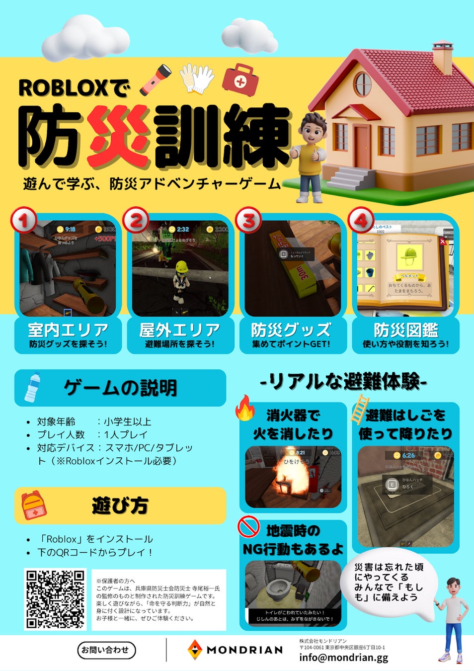 本ゲームはどなたでも自由に遊べますが、学校や地域イベント、研修などでの正式な導入や活用を希望される場合は、モンドリアンまでお問い合わせください。本プロジェクトは、地域の防災意識を高めるために、教育現場や地域団体の皆さまに無償でご活用いただけます。