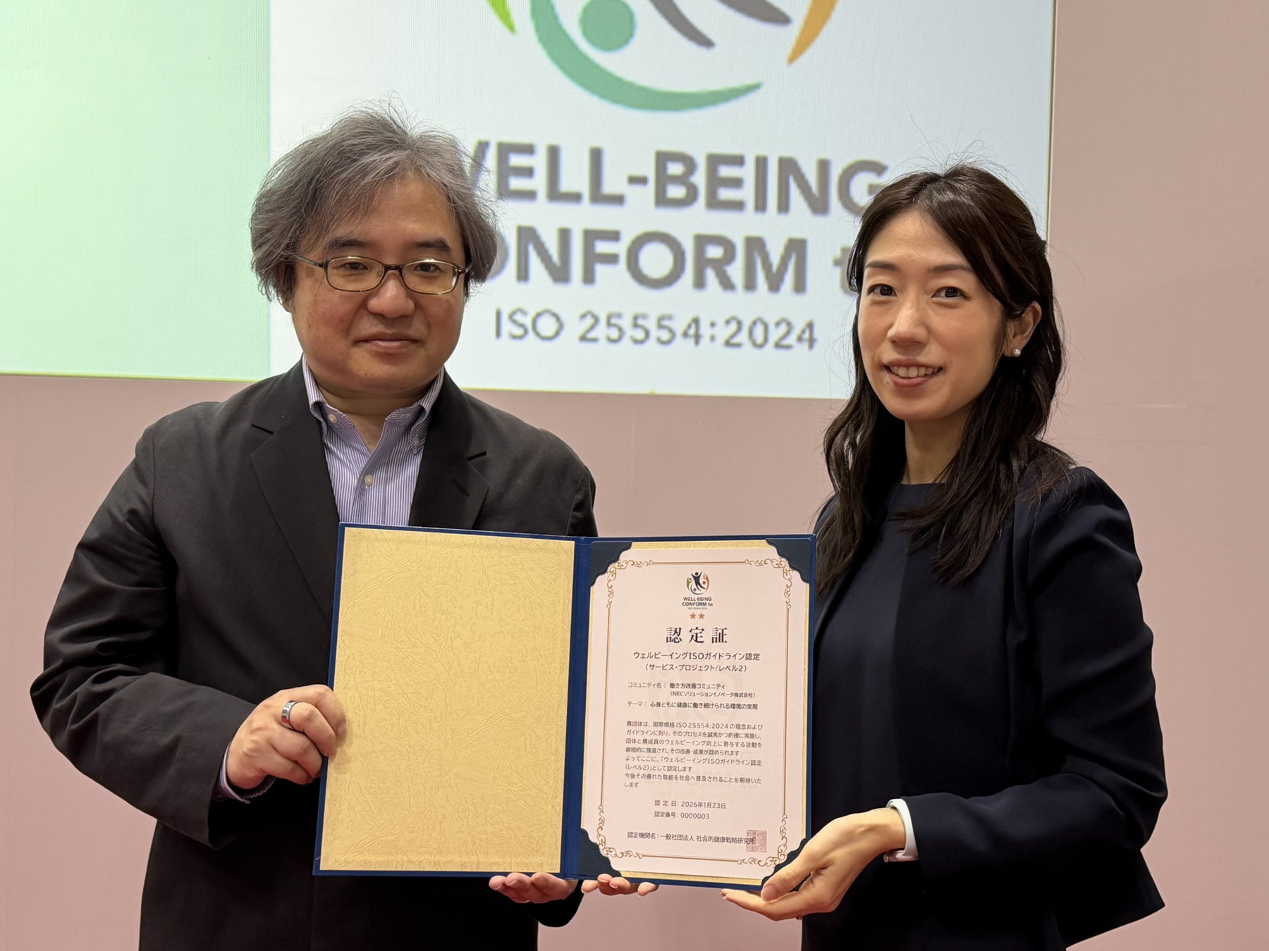 NECソリューションイノベータは、一般社団法人社会的健康戦略研究所が運営する「ウェルビーイングISOガイドライン認定」制度における初の審査において、国内で初めて「認定レベル2」に認定されました。