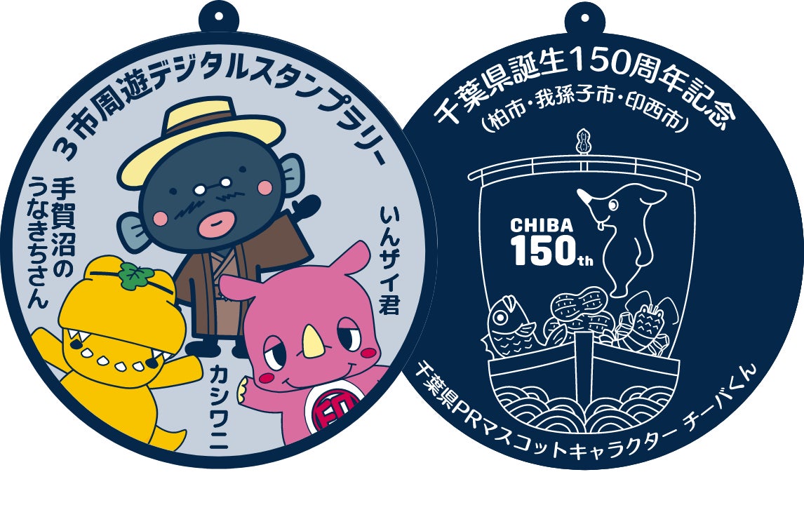 3市のマスコットキャラクターをあしらった特製ラバーキーホルダーで、裏面には千葉県誕生150周年記念ロゴマークも掲載しています。
