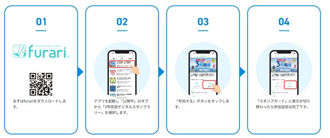 スマートフォンに「furari」アプリをインストールするだけで、簡単に参加できます。