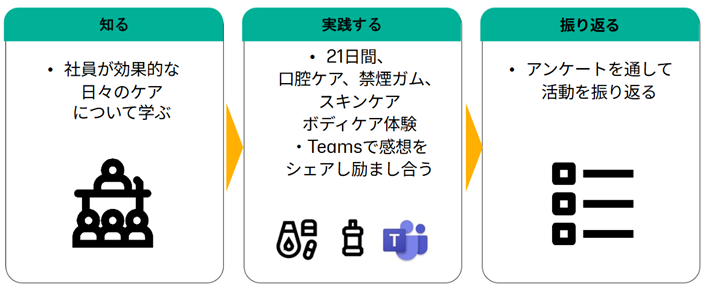 Kenvue(ケンビュー)は、社員が自らをいたわり健康について考える、セルフケアの習慣化・定着させることを目的に、マウスウォッシュ、スキンケア、ボディケア、禁煙補助剤の4ブランドを横断した「21日間セルフケアチャレンジ」を実施しました。本チャレンジは、「日々のケアがもたらす驚くべき力を解き放つ」というパーパスを掲げるKenvue社員自らが、1日1分でも自分の健康に向き合い、ケアする時間を持つことの大切さを理解し、実践することを狙いとしています。
