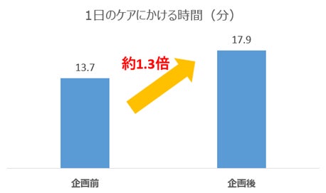チャレンジ参加前後で、1日のセルフケアにかける時間が平均約1.3倍に伸長し、日々の行動変容に繋がった。特に、20分以上と回答した人約40%から約60%に増加し、5分以下と回答した人は約29%から約10%に減少した。1分以下と回答した人はゼロになった。
