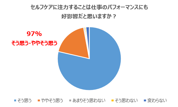 ほぼ全員がセルフケア意識の向上を実感し、今後も日々のケアに注力していきたいと回答したほか、こうした日々のケアはウェルビーイングにも繋がっていると回答。97%が仕事のパフォーマンスにも好影響があったと回答した。