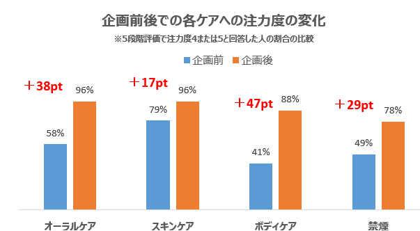 企画前後でのケアの注力度合いを5段階で取ったところ、オーラルケア・スキンケア・ボディケア・禁煙のすべてのカテゴリーにおいて、注力度が上昇した。特にボディケア・オーラルケアでは注力度4または5(5段階評価)と回答人がそれぞれ41%⇒88%(+47pt)、58%⇒96%(+38pt)と増加し、企画が日々のケアの行動の変化に寄与したことが伺える。