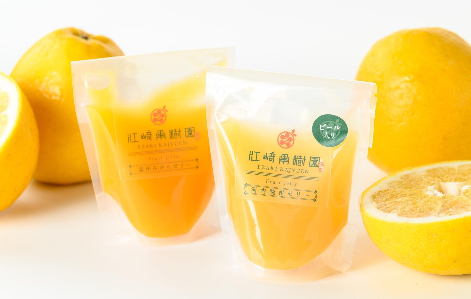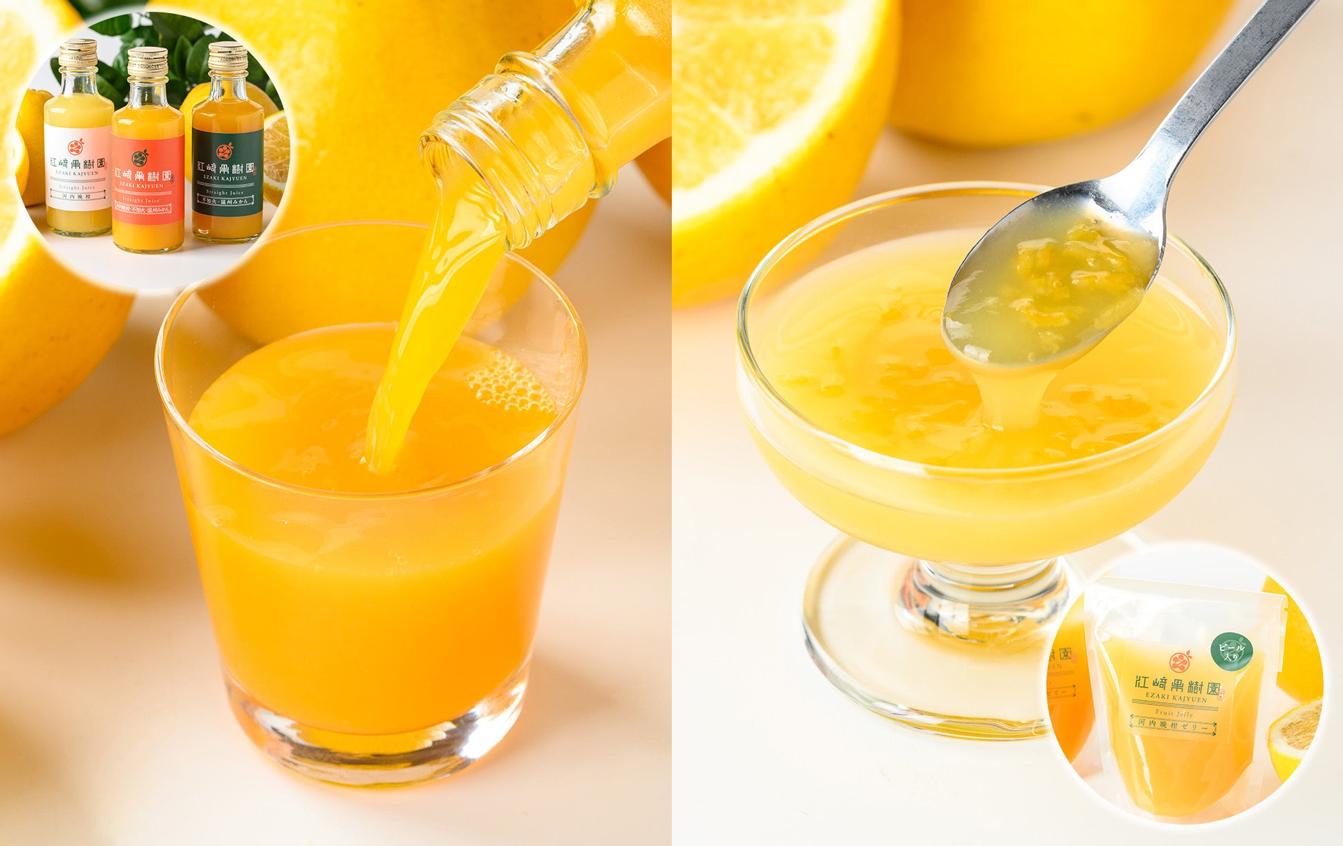 今回紹介するのは、江崎果樹園で採れた柑橘をたっぷり使った贅沢ジュースと、風味豊かなピール入り河内晩柑(かわちばんかん)のゼリーセットの2種類。どちらも素材の風味そのまま、凝縮した味わいです。