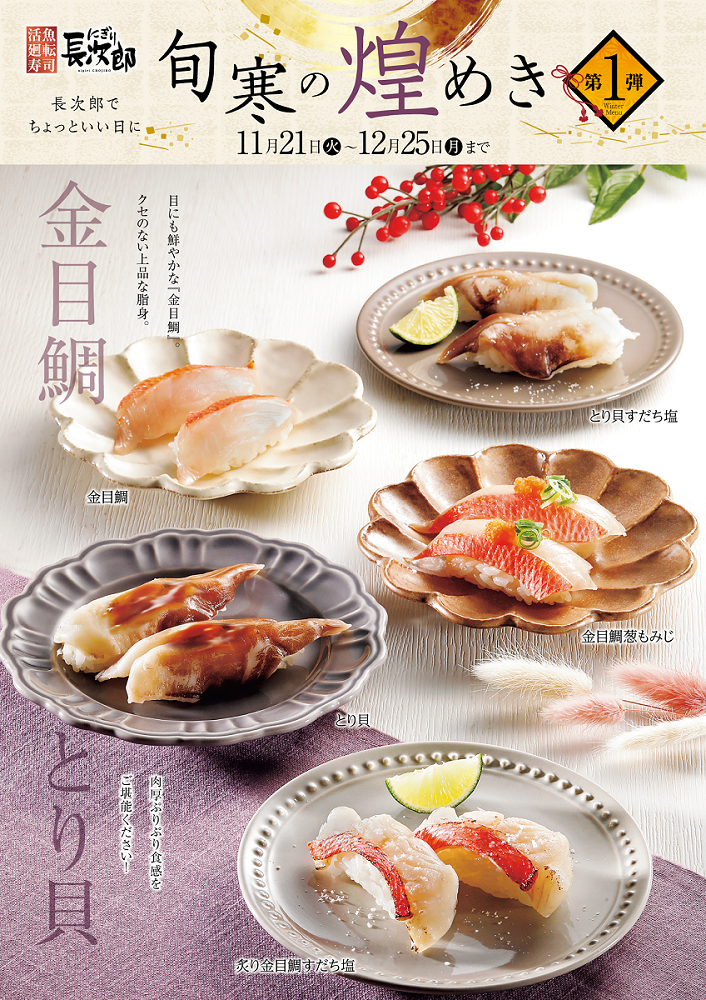 冬の第1弾は金目鯛ととり貝をメインに、さまざまなメニューをご用意し、皆様のご来店をお待ちしております。