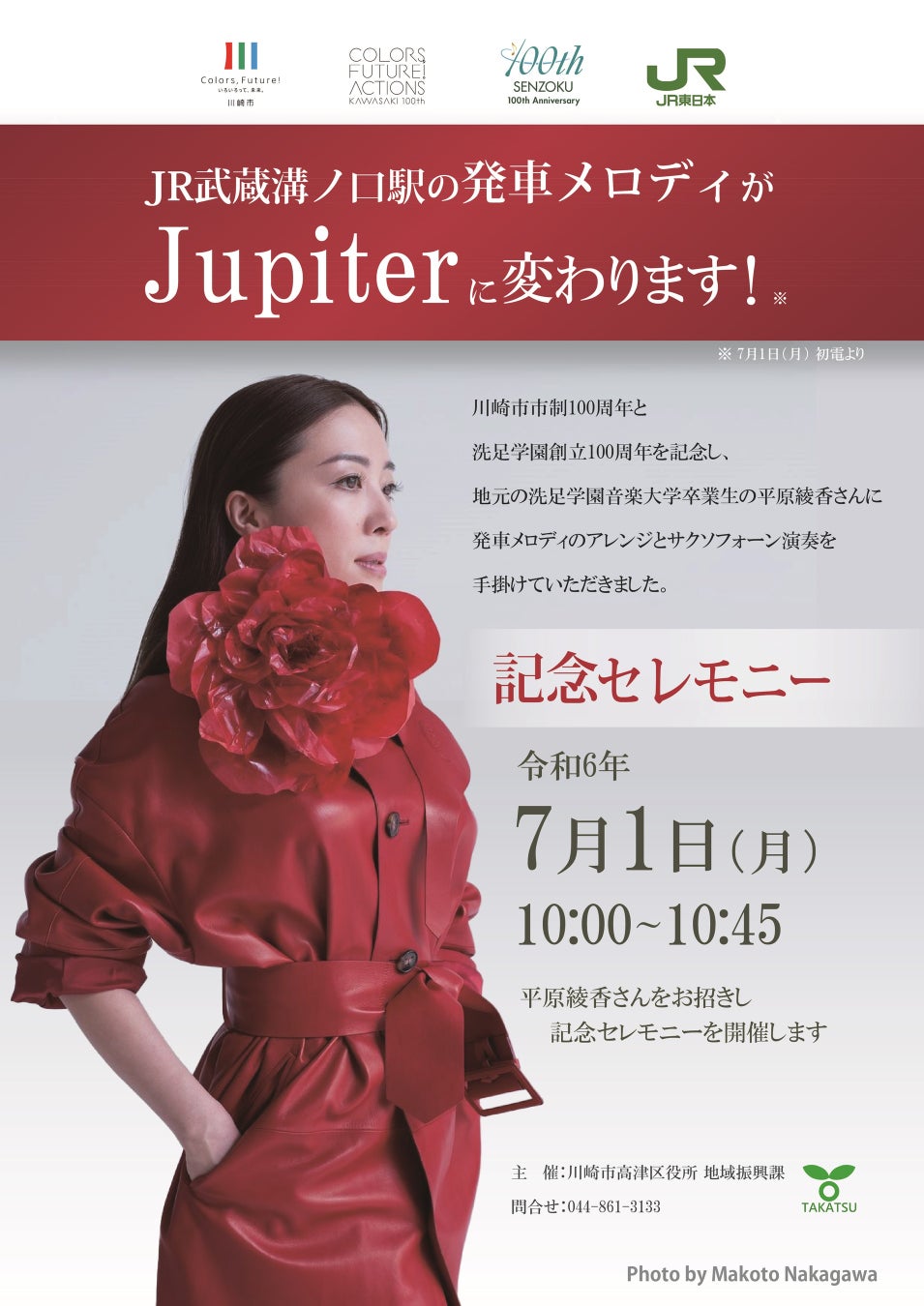 川崎市市制100年を迎える7月1日から、 JR南武線武蔵溝ノ口駅の発車メロディが、高津区にゆかりのある、洗足学園音楽大学出身の平原綾香(ひらはら あやか)さんのデビュー曲「Jupiter」に変わります。川崎市市制100周年と高津区に所在する学校法人洗足学園の創立100周年という節目が重なったことで実現しました。
