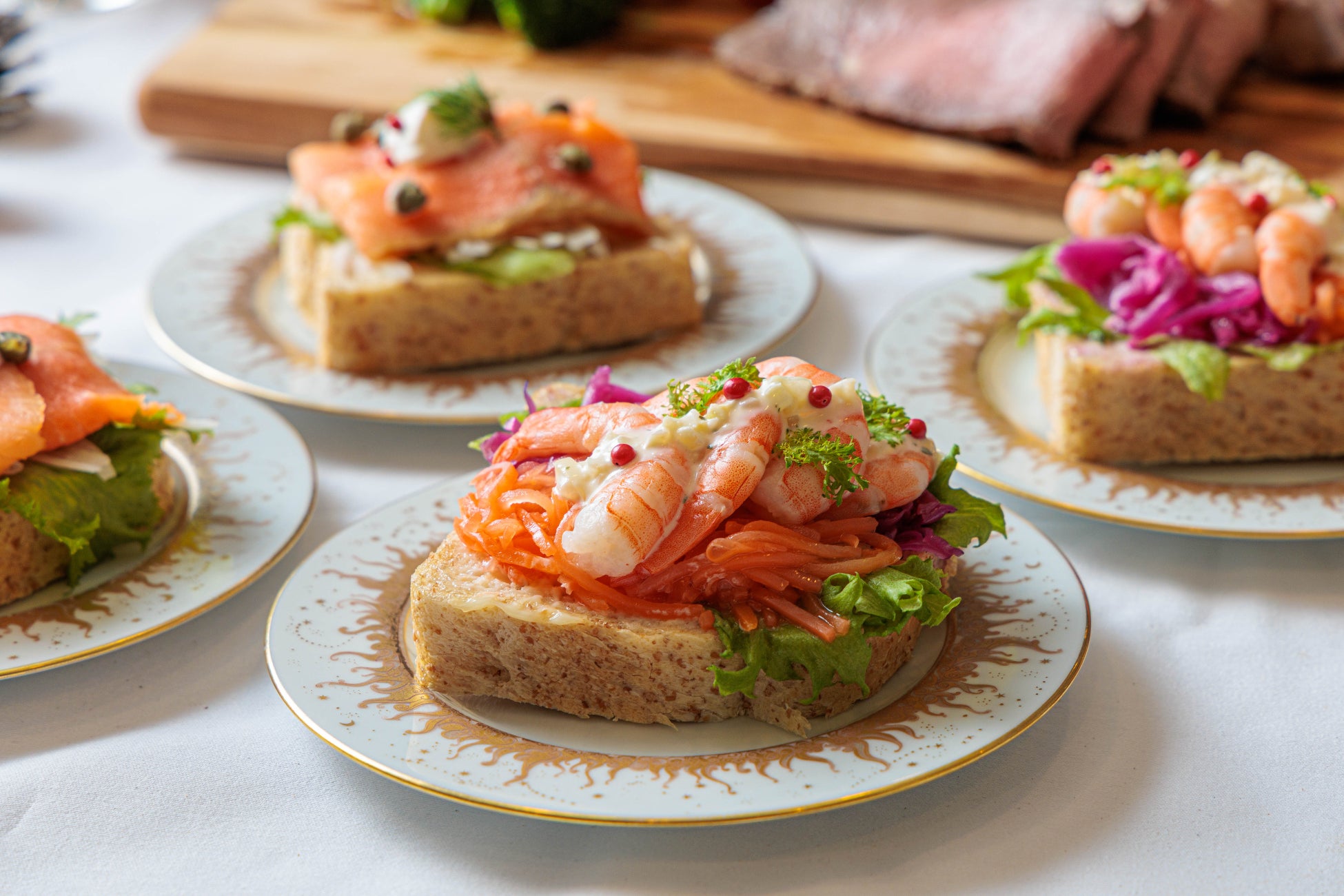 (北欧料理)ミートボール、フレスケスタイ、スモーブロー、サーモンのロースト (クリスマス料理)ローストチキン、ビーフシチュー、各種オードブル、クリスマススイーツ など