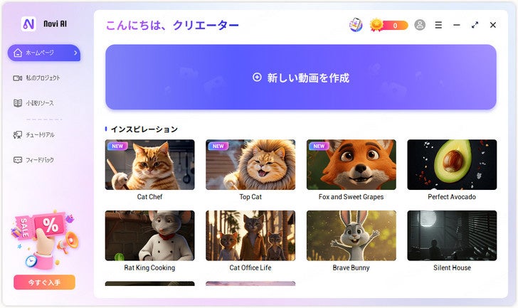 ステップ1. 上記のボタンからNovi AIをダウンロードして起動し、「新しい動画を作成」を選択します。
