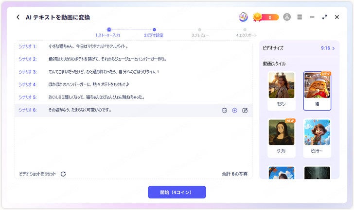 ステップ3. 物語をアップロードすると、Novi AIがテキストを分析し、自動で脚本を作成します。シーン内容は自由に修正・追加・再生成できます。動画のサイズやスタイルも選べます。準備ができたら「開始」をクリックしましょう。