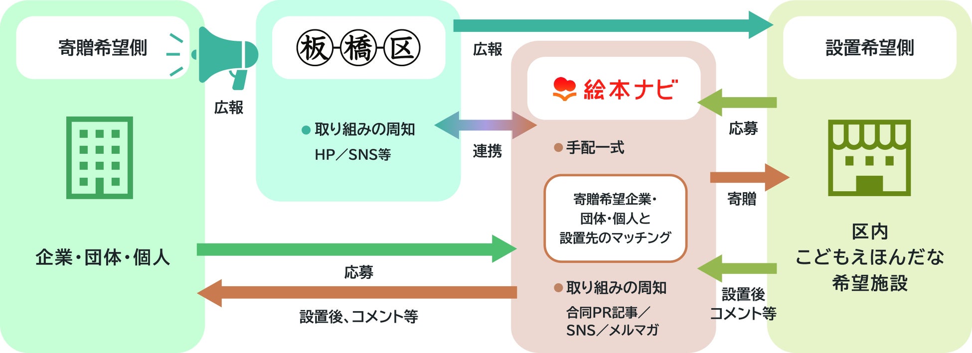 設置を希望する施設や、寄贈を希望する企業・団体・個人は、絵本ナビに応募し、絵本ナビが審査とマッチングを行います。区は、支援希望者や設置希望施設等への広報や取組の周知を行います。