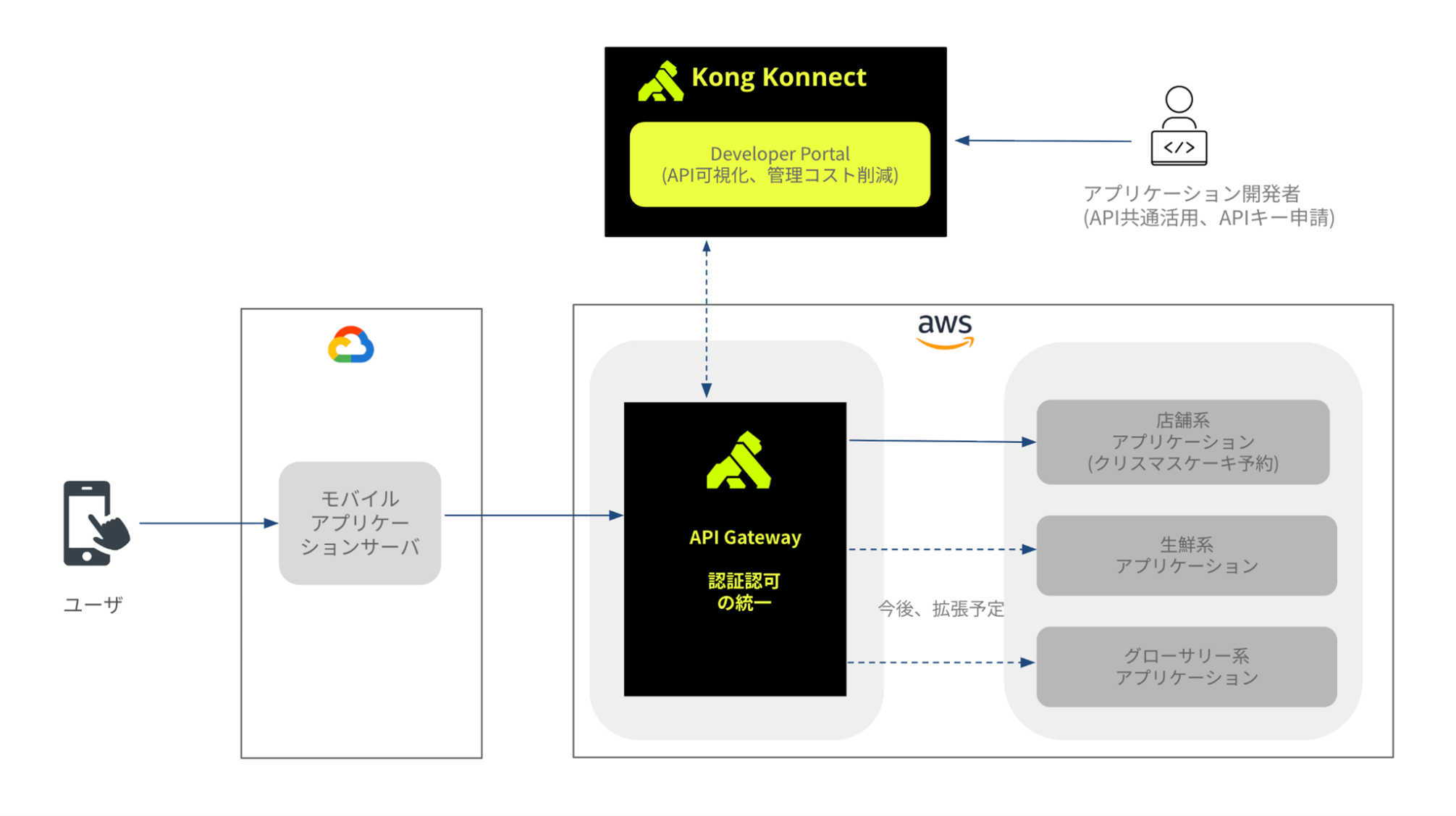 第一弾のプロジェクトとして、2025年冬の「クリスマスケーキ予約システム」にて運用を開始しました。異なるクラウド環境を跨ぐ通信を「Kong」で制御することで、繁忙期における安定稼働とセキュアな接続を実現しています。今後は、店舗系、生鮮系、グロサリー系などの主要業務システムへ順次適用範囲を拡大し、全社横断的なAPI管理プラットフォームの構築を目指します。