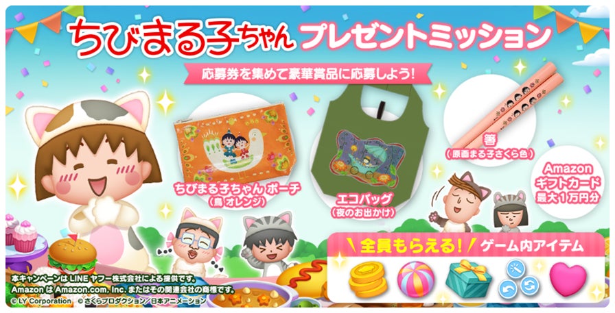 期間中、『ちびまる子ちゃん』グッズやAmazonギフトカードなどの豪華賞品が当たるプレゼントミッションを開催します。様々なミッションをクリアして応募券を集めましょう。奮ってご参加ください。