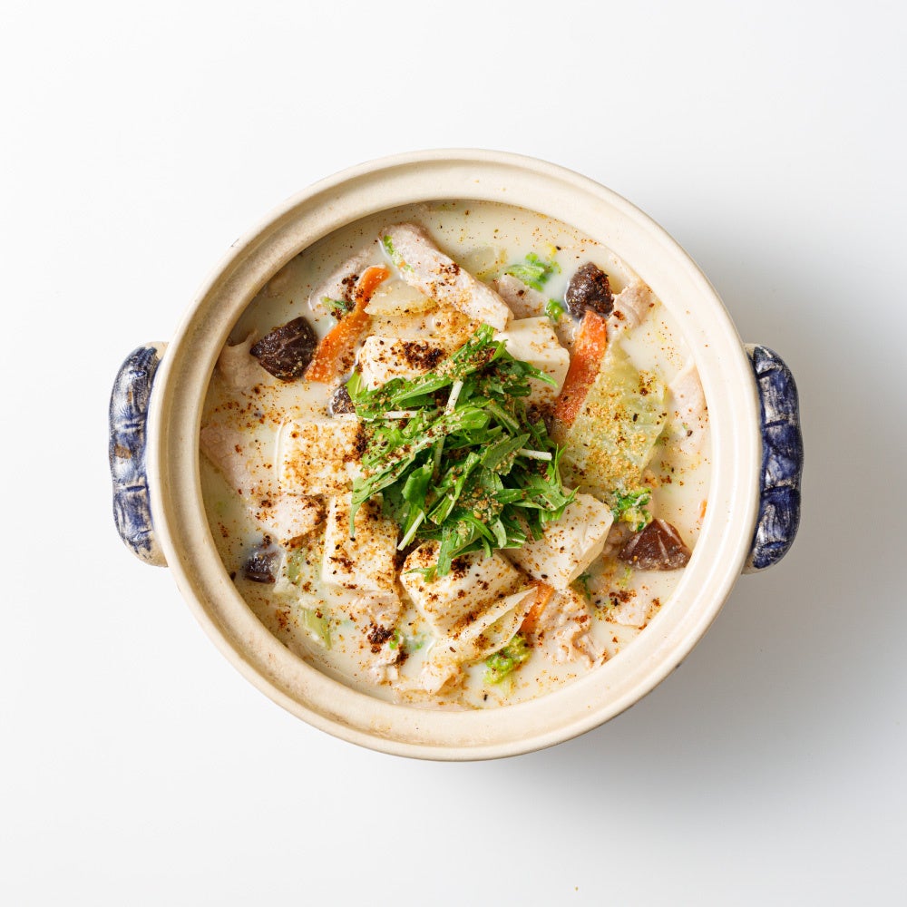 ねりごま・黒すりごま・金すりごまの3種類のごまを使用しています。まろやかな豆乳ベースの鍋つゆでほっこりする味わいに仕上げました。野菜の旨味がたっぷり溶け出し、鍋の甘さを引き立てます。山椒が効いた“黒ごま七味”をかけることで、より上品で贅沢な味わいをお楽しみいただけます。