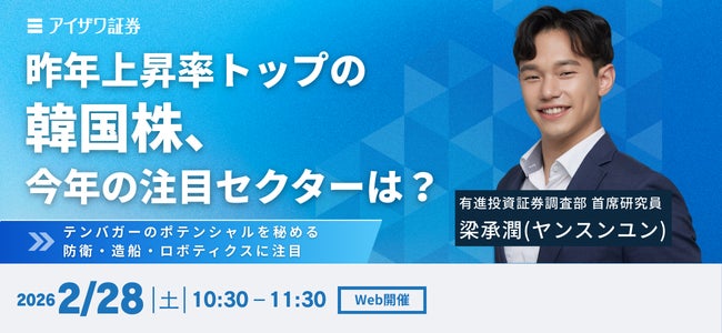 アイザワ証券株式会社(本社所在地:東京都港区、代表取締役社長:藍澤 卓弥、以下「当社」)は、2026年2月28日(土)、成長が期待される防衛・造船分野を中心に韓国株の見通しについて解説するWebセミナー(以下「本セミナー」)を開催いたします。