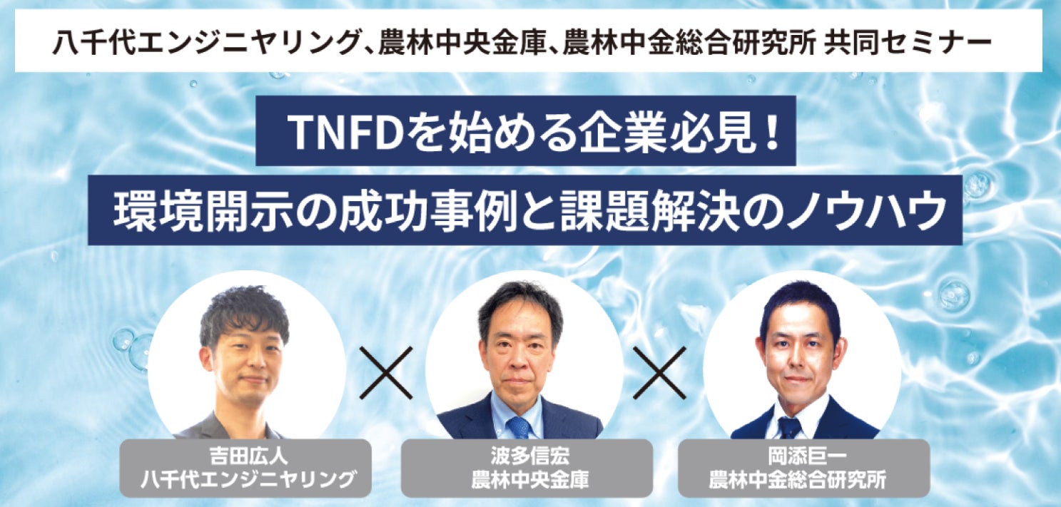 八千代エンジニヤリング株式会社(本店:東京都台東区、代表取締役社長執行役員:高橋 努)は、農林中央金庫(本店:東京都千代田区、代表理事理事長 奥 和登、以下「農林中央金庫」)および農林中金総合研究所(本社:東京都渋谷区、代表取締役社長 高 義行、以下「 農林中金総合研究所」)との無料セミナー「TNFDを始める企業必見!環境開示の成功事例と課題解決のノウハウ」を2025年1月23日(木)にAgVenture Lab(東京・大手町)で開催します(定員50名)。なお、本セミナーを収録したものを、1月31日(金)にオンライン配信予定です。