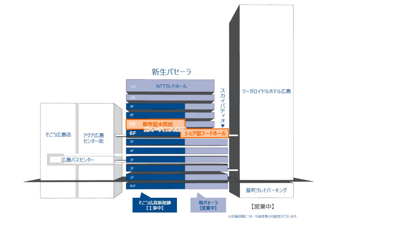 NTT 都市開発株式会社(本社︓東京都千代⽥区、代表取締役社⻑ 池⽥康 、以下 「NTT 都市開発」)は、基町クレド内の商業施設そごう広島店新館跡および現在営業中の店舗より構成される新⽣『パセーラ※2』の6 階・7 階において、2024 年春に先⾏リニューアルした屋上庭園「スカイパティオ」に続き、2025 年秋に「シェア型フードホール」および「都市型⽔族館」の誘致を決定しましたのでお知らせいたします。