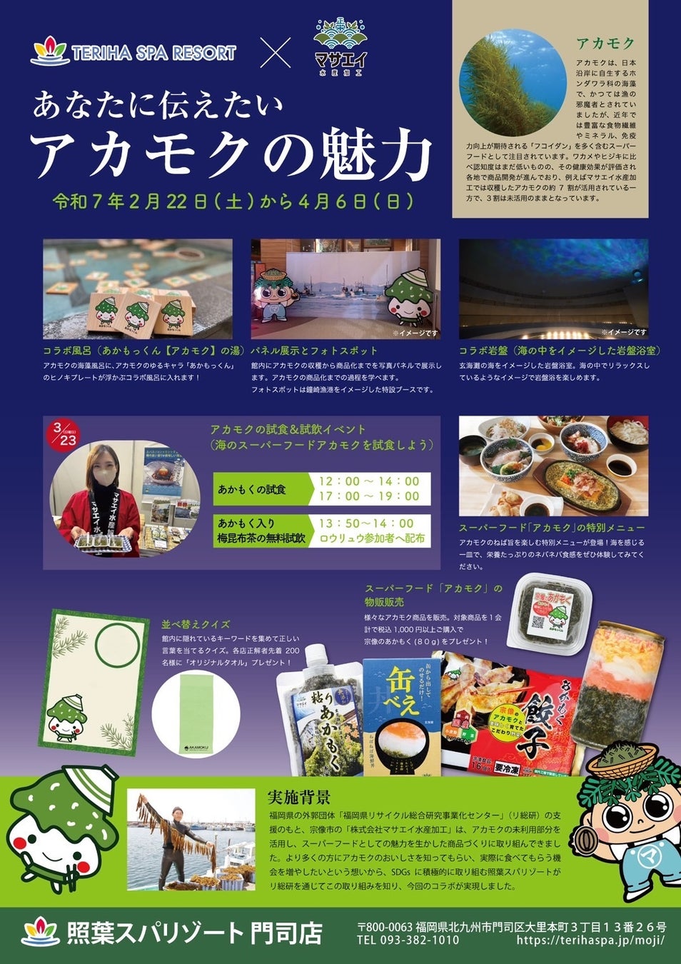 照葉スパリゾート門司店では、地域活性化やSDGsの取り組みの一環として、福岡県内の様々な企業や自治体とコラボを行っております。現在(2025年4月1日時点)は宗像市の水産加工会社とのコラボを行っており、まだまだ認知度は低いものの、近年スーパーフードとして注目されつつあるアカモクの魅力を伝える様々な取り組みを行っております。また地元の北九州のプロサッカーチームの応援もしており、2025年2月に行ったイベントでは、選手を招待してのサイン会や選手がお客様に熱波を届けるロウリュウイベントなどを行うなど、地域活性化の取り組みを積極的に実施しています。地域社会を元気にするためには個人個人が元気になることはもちろんの事、家庭や学校、会社を含めた生活している地域全体が元気でなくてはなりません。照葉スパリゾート門司店は、様々な企業・団体や自治体とのコラボを通じて、お客様・地域・施設の三方良しの関係を構築し、地域社会を元気にしていきたいと考えています。