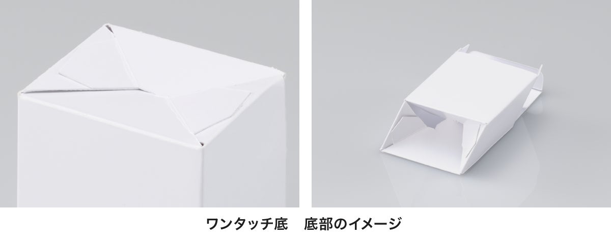 規格瓶用パッケージでは、底面の2ヶ所に糊付けされた「ワンタッチ底」のため、重量物を入れても底抜けの心配がございません。また、組み立ての際には箱を開くだけ(ワンタッチ)で組み上がるため、内容物の梱包作業も効率良く行うことができます。