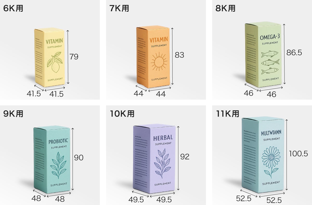 「健康食品用パッケージ」のラインナップに、サプリや錠剤などを入れる小瓶の梱包に最適な「規格瓶用」のパッケージ形状を新たに追加いたしました。規格瓶6Kサイズ用から11Kサイズ用まで、全6種の大きさをご用意しております。