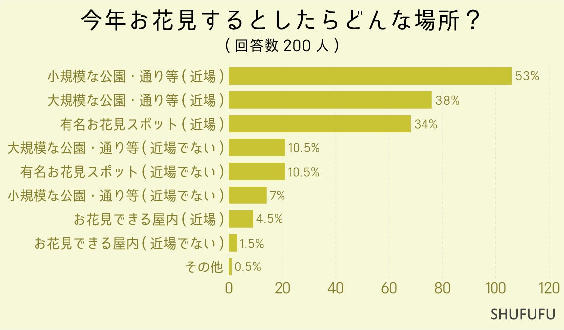 今年お花見するとしたらどんな場所?(複数回答可)に関しては1位「小規模な公園・通り等(近場)(53%)」でした。混雑しにくくて行きやすい場所というのがポイントになるのでしょうか。