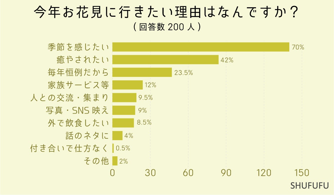 今年お花見に行きたい理由はなんですか?(複数回答可)を尋ねたところ、1位は「季節を感じたい(70%)」、2位「癒やされたい(42%)」となりました。