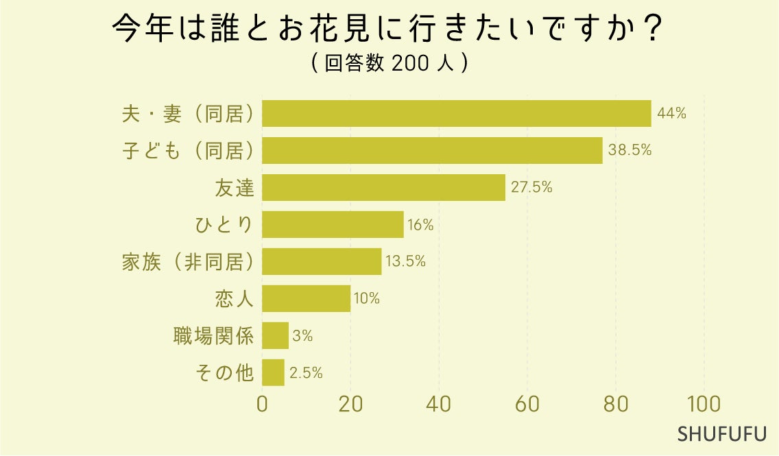 今年は誰とお花見に行きたいですか?(複数回答可)の問いに対して最も多かったのが「夫・妻(同居)(44%)」でした。 次いで「子ども(同居)(38.5%)」「友達(27.5%)」という結果でした。 同居の家族と行きたいという方が多かったです。