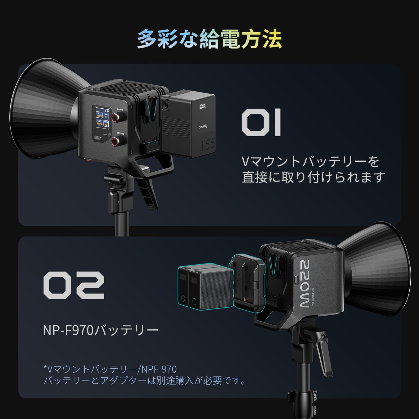 多彩な給電方法に対応しています。ライトの背面にはVマウントバッテリー用のマウントがあり、Vマウントバッテリーを直接取り付けて給電することができます。また、NP-F970バッテリープレートを使用することで、NP-F970バッテリーでの給電も可能です。