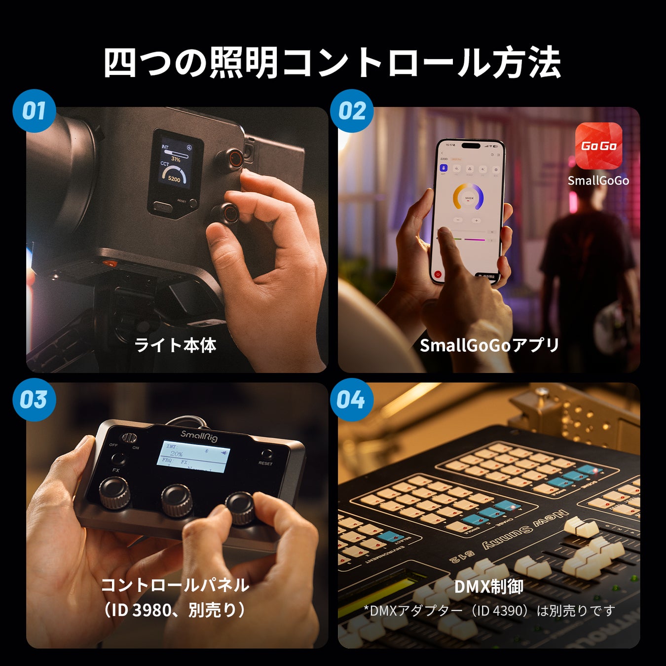ライト本体のボタンで照明設定を調整できるほか、「SmallGoGoアプリ」を接続することで、離れた場所から簡単に制御できます。また、コントロールパネルやDMX制御など、さまざまな制御方法にも対応しています。