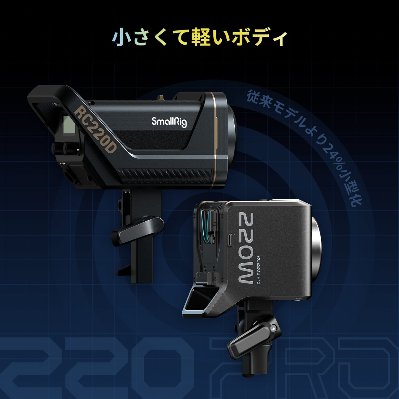 RC 220 Pro COB LEDビデオライトシリーズは、小型で軽量なボディが特徴で、前世代と比較して24%小型化されています。