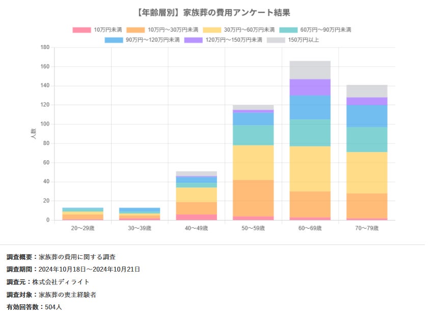 年齢別に家族葬の費用を調査したところ、どの年代でも中心となる相場は30万円〜60万円未満であることがわかりました。