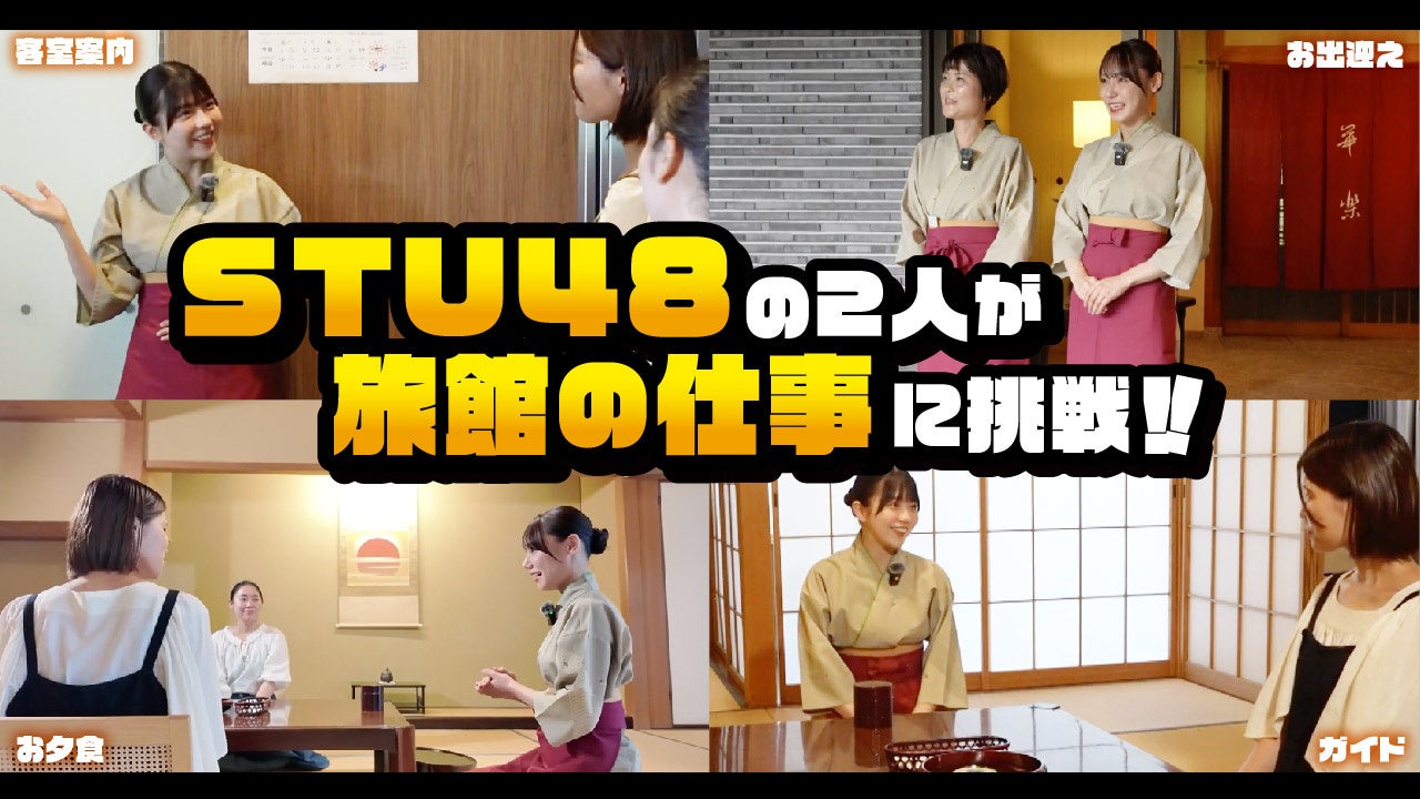 STU48 は、中国運輸局からの依頼を受け、宿泊業の魅力を発信する取り組みを行いました。昨年の訪日外国人旅行者数は過去最高を記 録し、インバウンド需要は増加し続けていますが、それに対応する宿泊業界では人材不足が深刻化しており、旅行者の受け入れに課題が 生じています。この状況を踏まえ、特に就職を考えている方々に宿泊業への関心を持ってもらうことを目的として、日本旅館協会中国支部連 合会および日本ホテル協会中国四国支部と協働しました。この取り組みの一環として、STU48 の工藤理子と兵頭葵は「宮島グランドホテル 有もと」にて仲居として旅館業を体験し、岡村梨央と中村舞は「リーガロイヤルホテル広島」にてレストラン業務を含むホテル業務を実際に体験しました。STU48 メンバーによるこの体験を通じて、宿泊業の魅力を広く発信し、次世代の担い手となる若者たちに関心を持ってもらうこと を目指しました。また、普段どのような仕事をしているのか?何に気をつけて仕事しているのか?宿泊業だからこその魅力や働きがいなど、 スタッフの方々にもインタビューした YouTube 動画を通して、お伝えします。是非、ご視聴ください。
