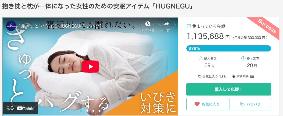 好評につき延長決定!抱き枕と枕が一体化した、離れない寝心地の「HUGNEGU」(ハグネグ)クラファン達成率378% 7月29日まで