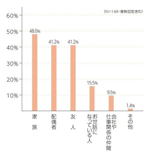 贈る相手は「家族」約50%、「配偶者」「友人」約40%(複数回答あり)がいずれも多数。