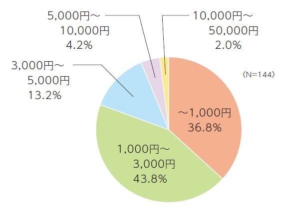 バレンタインデーで費やす金額は、「1,000円~3,000円」が最も多く、次いで「1,000円以下」という結果でした。総額「5,000円以下」が全体の約9割を占める一方、少数ですが5,000円から数万円を費やす方もいて、バレンタインを優雅に楽しむシニアライフがうかがえます。
