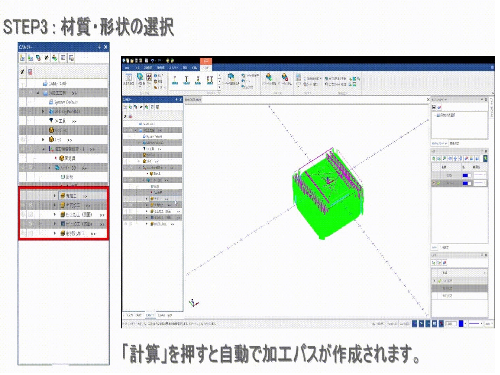 「Mill-Key Pro 5040」には、専門知識を必要とせずに簡単に加工プログラムを作成できるCAMソフト「BobCAD-CAM for Mill-Key Pro」がオプションで提供されています。このソフトは、プログラム作成に必要な4つのステップをシンプルに行えるよう設計されており、初心者から経験豊富なユーザーまで誰でも容易に使用することができます。