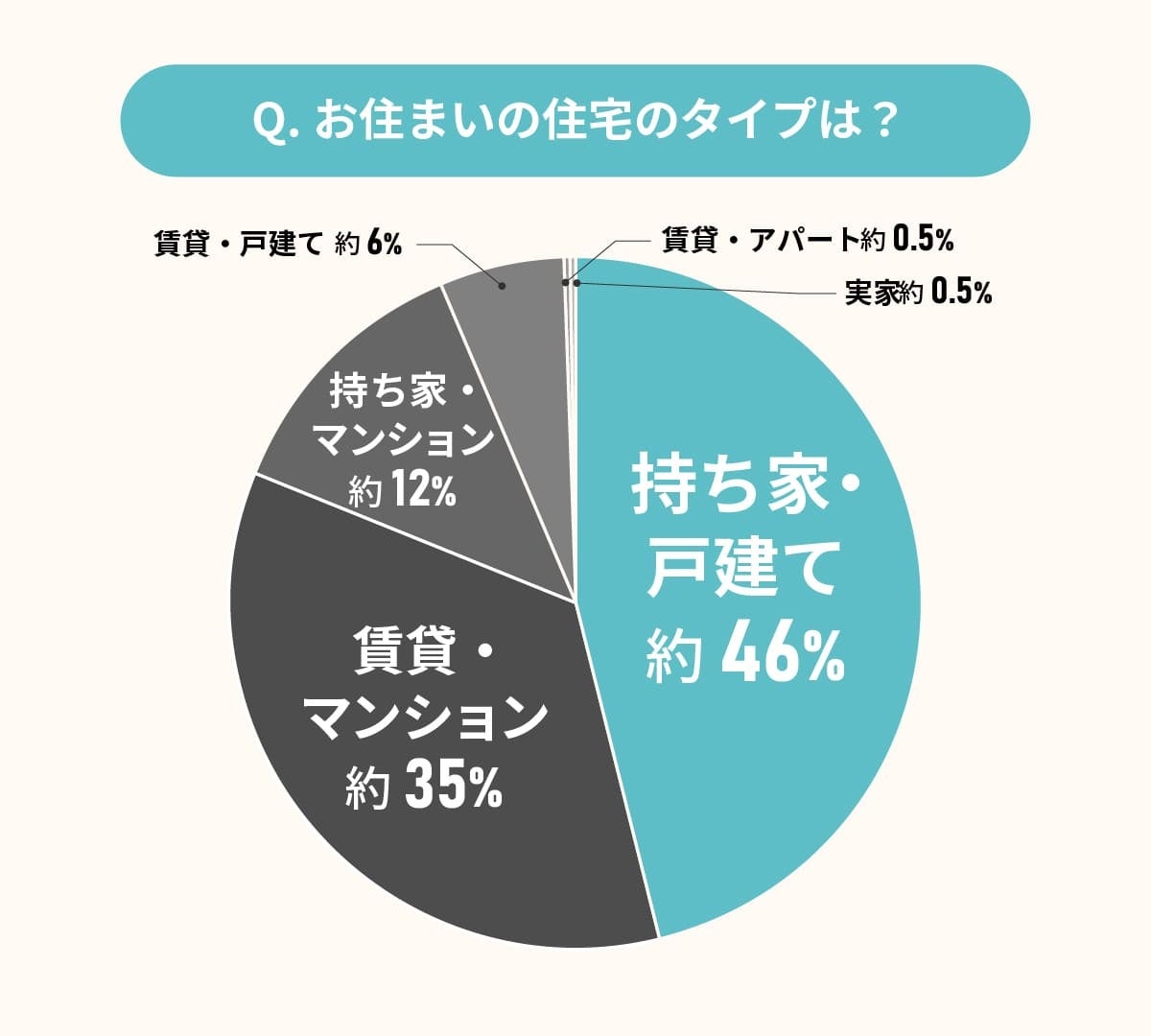 最多は「持ち家・戸建て」の約46%でした。次いで「賃貸・マンション」も約35%と多めでした。「持ち家・マンション」「賃貸・戸建て」など、その他の物件タイプの方も、一定数いました。