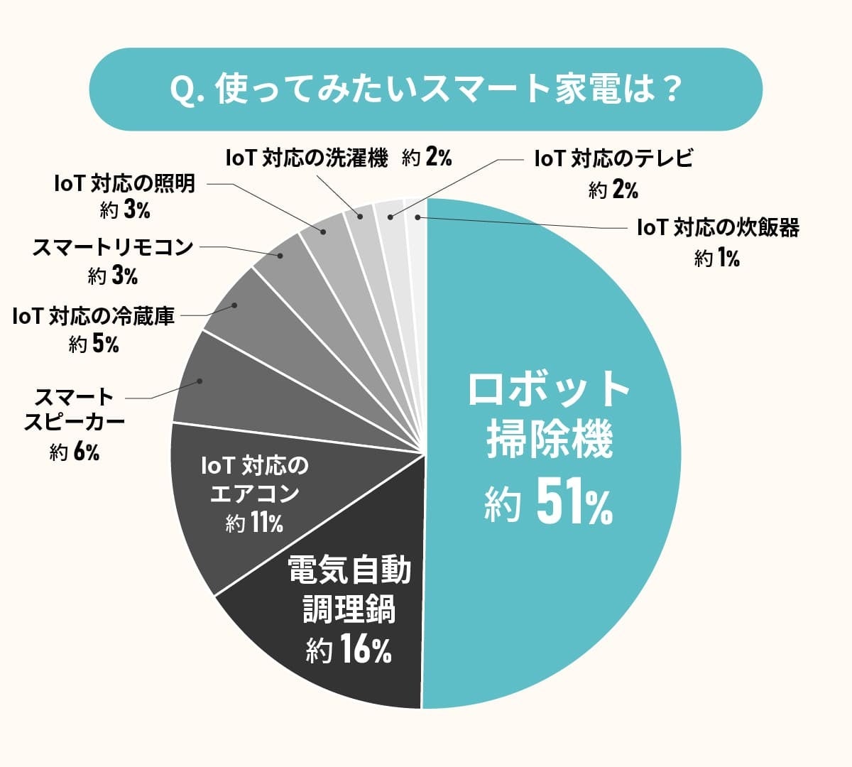 使ってみたいスマート家電の1位は、「ロボット掃除機」という結果となり、過半数を占めました。掃除は時間的にも体力的にも負担の大きい家事とされ、その負担を軽減できるスマート家電として、大変魅力的なようです。「電気調理鍋」や「IoT対応の冷蔵庫」などは、利便性はもとより、食費の節約にもひと役買ってくれそうです。