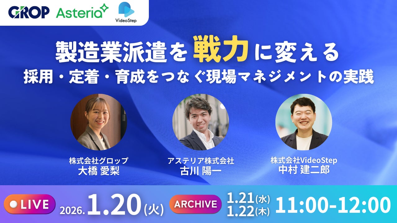 人材サービス事業を展開する[株式会社グロップ](本社:岡山県岡山市、代表取締役社長:原田 竜一郎)は、2026年1月20日(火)に開催される企業人事向けウェビナー、『製造業派遣を“戦力”に変える ──採用・定着・育成をつなぐ現場マネジメントの実践』に登壇いたします。本ウェビナーでは、これらを現場マネジメントの一貫した流れとして設計することで、派遣社員を最大限に活かし、貴社の生産性を高める具体的なアプローチなど実践的なヒントをお伝えします。