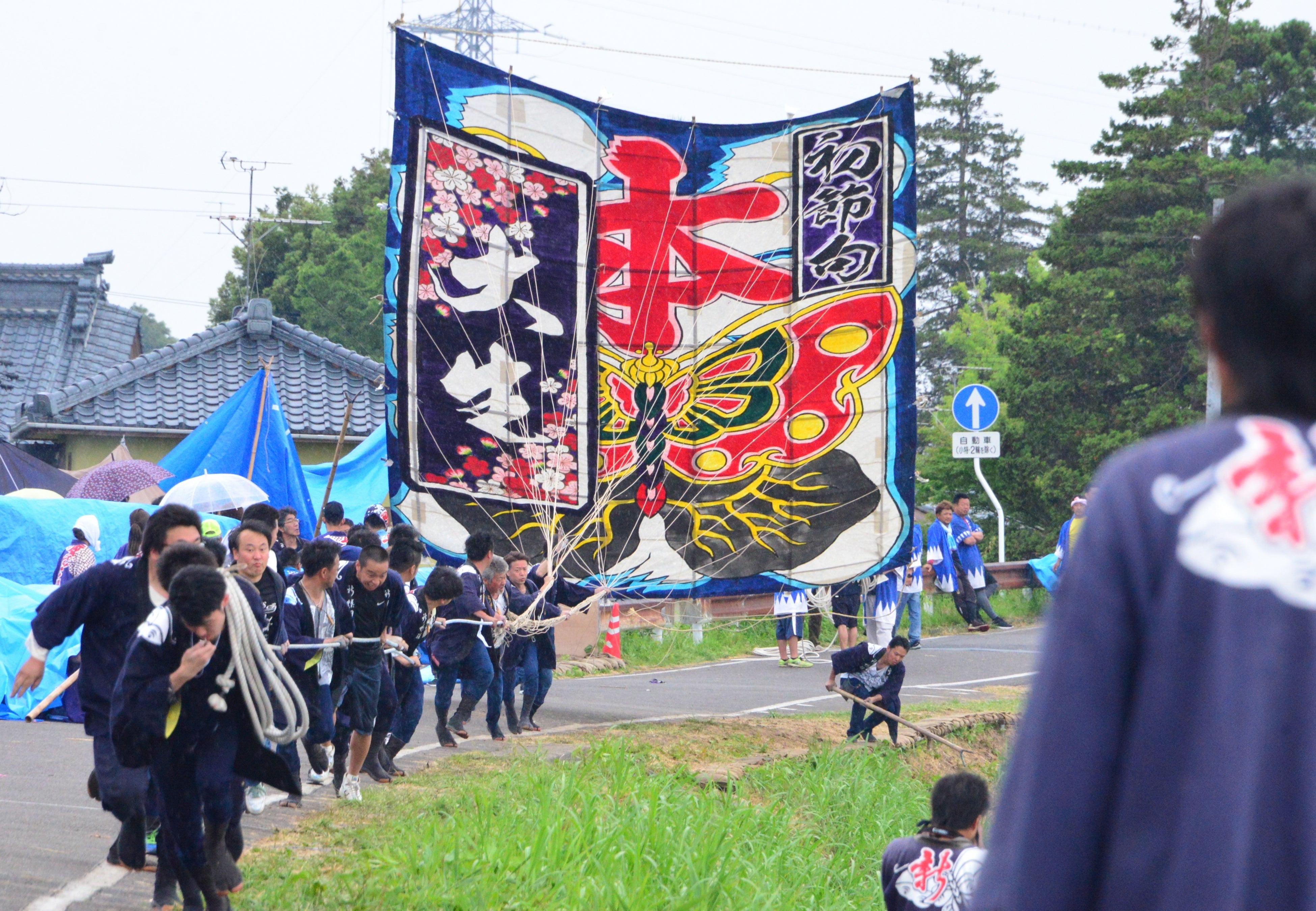 越後平野を流れる大河、信濃川の支流、中ノ口川(川幅約80m)の両岸から24畳の大凧を揚げ、空中で絡ませ川に落し、相手の凧綱が切れるまで引き合う勇壮な世界最大スケールの大凧合戦です。