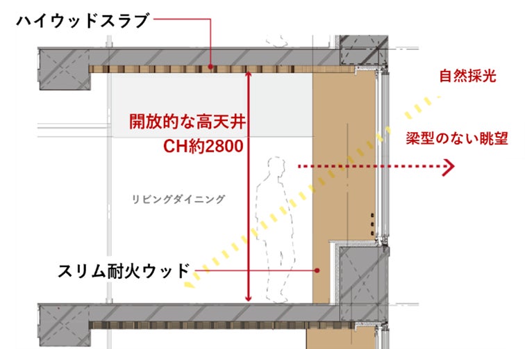 住戸の内装は、RC床スラブ(鉄筋コンクリート床)の型枠に天然木を使用し、そのまま仕上げ材として活かす「ハイウッドスラブ」を採用したことや、通常は天井側に下がる梁を床側に立ち上げて設置する工法である「逆梁構法」を採用したことで、住戸リビング・ダイニングは賃貸マンションとしては類例の少ない天井高さ約2.8mとなる天然木天井を実現しました。窓側に下天井がないため視界が開け、空が大きく感じられる、明るく開放的な居住空間となっています。