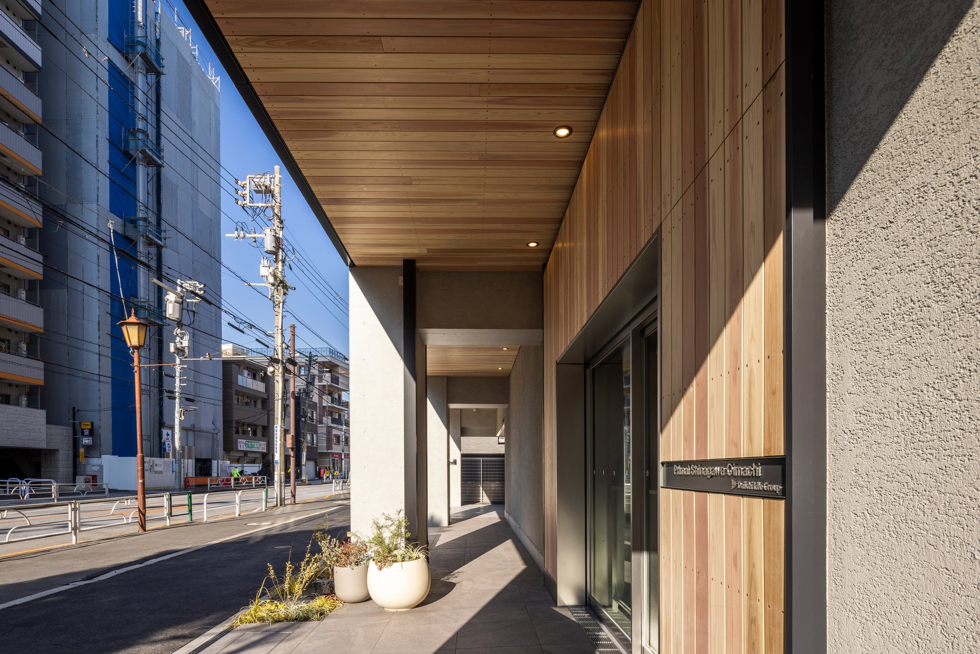 外観についても、住戸バルコニーの軒天井にハイウッドスラブを採用し、さらに1階エントランス回りに天然木仕上げを施したことで、都心にありながらも木の温もりを感じることができる外装を実現しました。